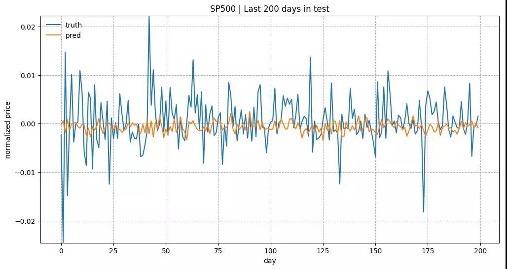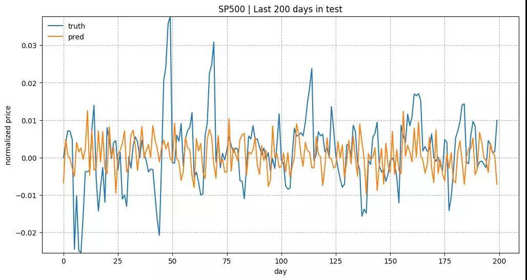 测试数据中最近200天的预测结果。 模型是用 input_size= 5 和 lstm_size= 128 来训练的。