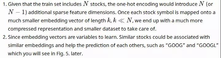 模型建立的预期是了解不同股票的价格序列。 由于不同的基本模式,我们想告诉模型应该操作哪一支股票。 嵌入(Embedding)比独热编码(one-hot encoding)更受欢迎,因为: