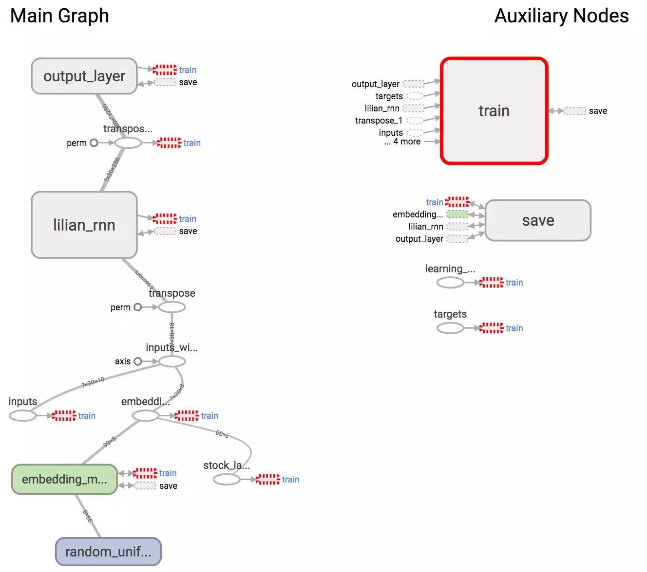 (1) As demonstrated in tutorial Part 1: Define the Graph, let us define a tf.Graph() named lstm_graph and a set of tensors to hold input data, inputs, targets, and learning_rate in the same way. One more placeholder to define is a list of stock symbols associated with the input prices. Stock symbols have been mapped to unique integers beforehand with label encoding.