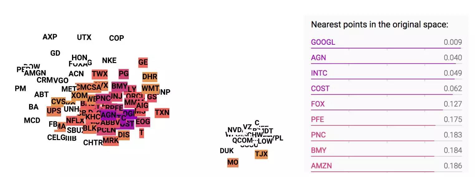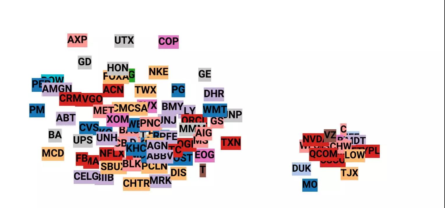 使用t-SNE可视化嵌入股票。 每个标签都是基于股票行业的颜色。