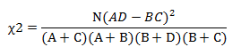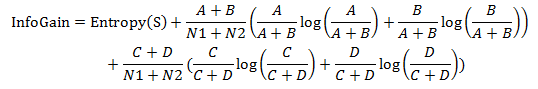 1.5 进一步化简,注意如果给定了一个文档集合(例如我们的训练集)和一个类别,则N,M,N-M(即A+C和B+D)对同一类别文档中的所有词来说都是一样的,而我们只关心一堆词对某个类别的开方值的大小顺序,而并不关心具体的值,因此把它们去掉是完全可以的,故实际计算的时候我们都使用