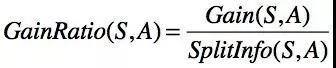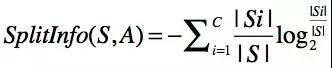 C4.5是在ID3基础上的扩展,不同的是,C4.5用的是信息增益率来进行属性选择。信息增益率定义如下: