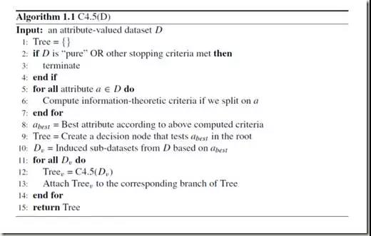 SplitInfo(S,A)指的是按照属性A对S的信息分裂值,用以将信息增益规范化,因此避免了ID3中指标偏向分支多的属性的倾向。C4.5算法框架如下: