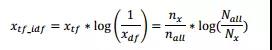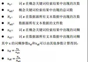 为词 x 的与关键词的TF-IDF关联度指标,其他符号意义如下: