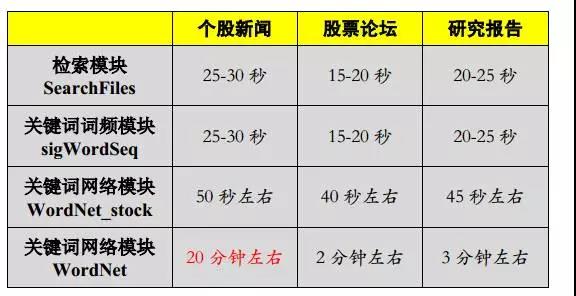 ▲ 在三个数据源中,所有模块个股新闻的平均运行时间是最长的,研究报告次之,而股票 论坛是耗时最少的