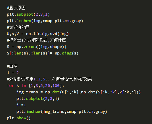 我们现在希望只用U,V中的k列的向量就能估计出这张图片,下面是Python代码