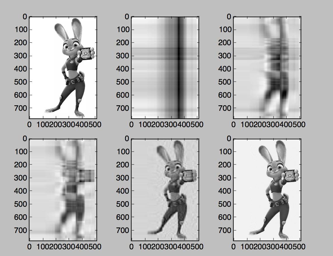 现在有一张朱迪的照片,这张照片有500多列的像素点构成,但是大部分地方都是白色的,相互没有什么差别,也就是说图像中有很多列都是相互线性相关的,这些列向量对我们接受图像信息没有更大的帮助。那么我们能不能找到一种方法,找出图像中相互**的列向量,用尽可能少的向量去估计这张图片?这种方法就叫奇异值分解SVD,或PCA主成分分析。