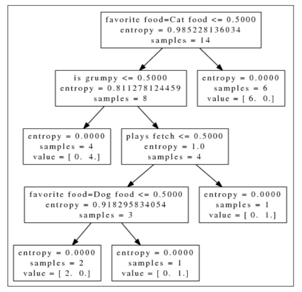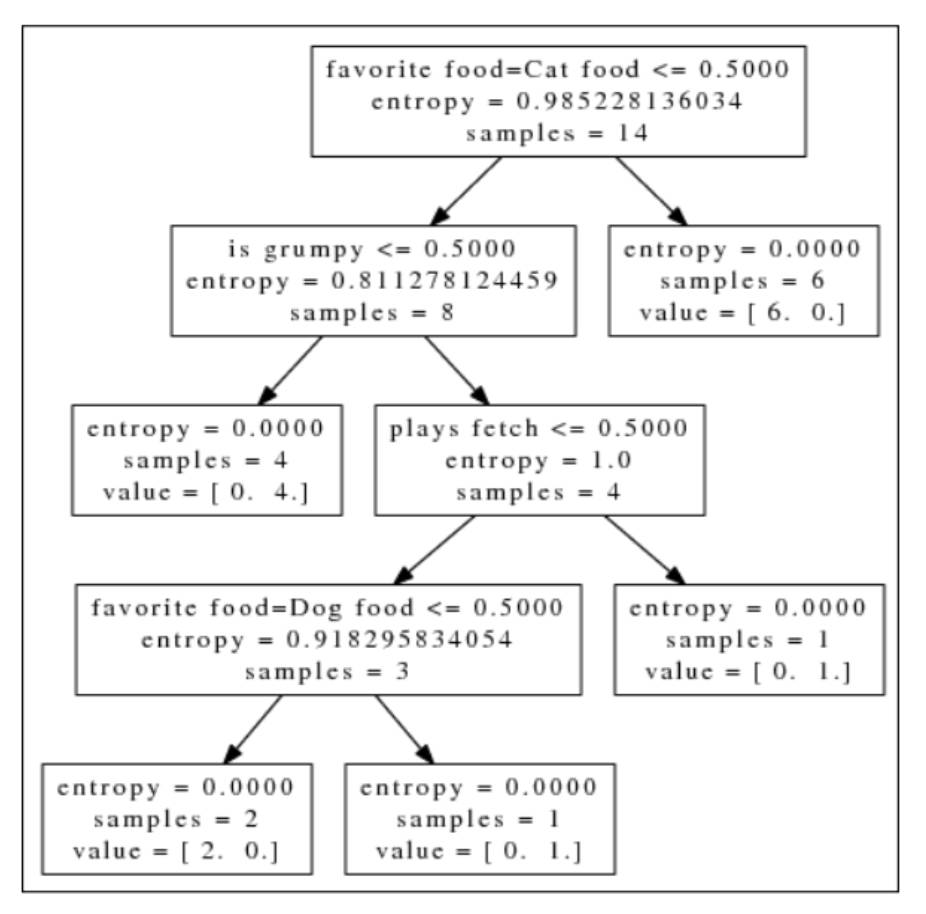 让我们来找第一个动物的类型, 它喜欢玩球, 不经常发脾气, 喜欢培根。沿着决策树往下走, 根节点测试不喜欢猫粮, 因此进入左节点。又不经常发脾气, 依然进入左节点, 现在的叶子节点只有狗, 因此这个动物种类是狗。其他动物也按照同样的方法去查找, 第三个动物是一只猫, 根节点测试不喜欢猫粮, 进入左节点, 然后经常发脾气, 进入右节点, 不喜欢玩球, 进入左节点, 喜欢狗粮, 进入右节点, 因此该动物是猫。