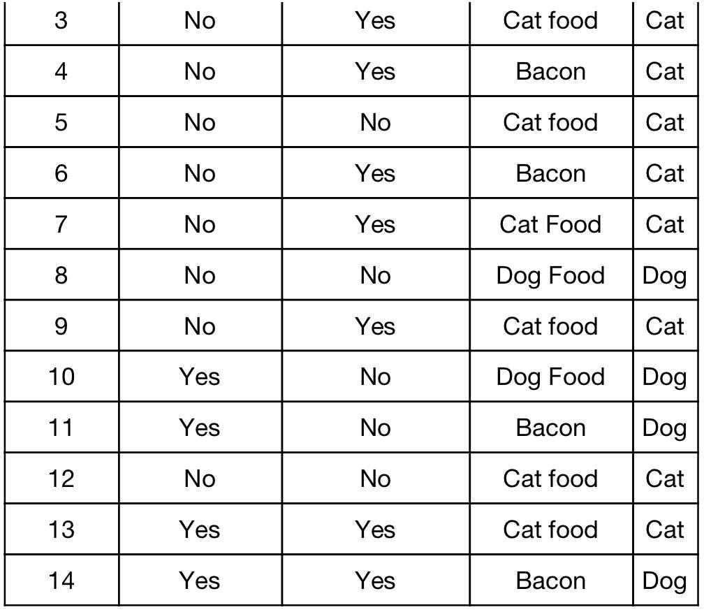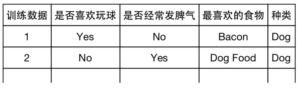 我们用Ross Quinlan发明的ID3(Iterative Dichotomiser 3,迭代二叉树3代)算法创建决策树, ID3是最早用于决策树的算法之一。假设你有一些猫和狗的分类数据。但是不允许直接观察, 你只能通过动物特征的描述去做决策。对每个动物, 你都会获得关于“是否喜欢玩球(play fetch)”和“是否经常发脾气”, 以及它最喜欢的食物三个问题的答案。