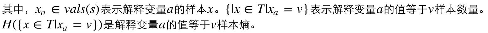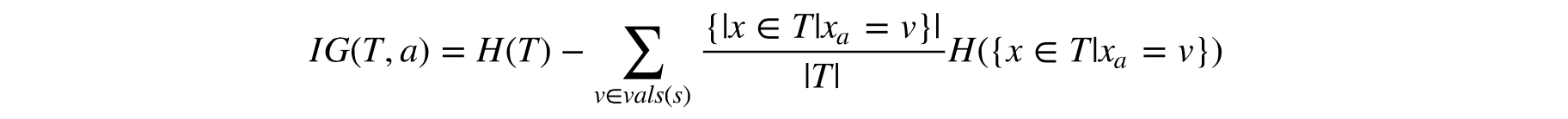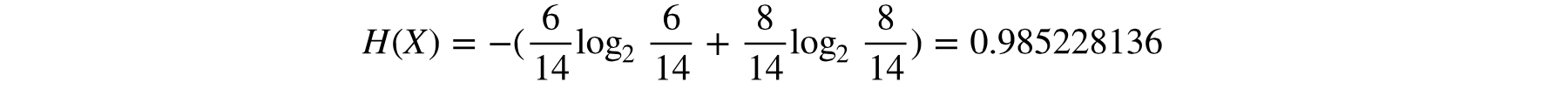 这就好像在猜猜看游戏中过早的问了太具体的问题, 而我们的问题并没有消除许多可能性。因此, 我们要用一种方法来合理度量熵的降幅, 这个方法称为信息增益(information gain)。信息增益是父节点熵, 用H(T) 表示与其子节点熵的加权均值的差, 计算公式如下: