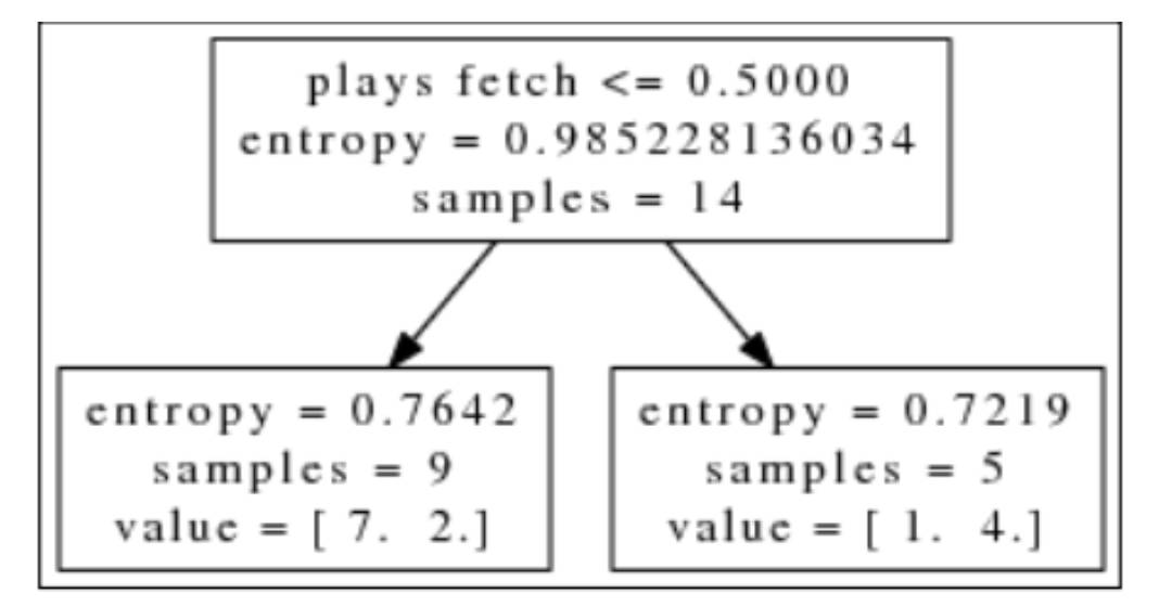 我们随机选择是否喜欢玩球? 这个解释变量来生成后面的节点,左节点包含一条狗, 右节点包含两只猫和一条狗。其他两个解释变量,最喜欢的食物 =狗粮和最喜欢的食物 =培根产生同样的结果, 左节点包含一条狗,右节点包含两只猫。然后, 我们随机选择最喜欢的食物 =狗粮进行测试,最终胜出决策树如下图所示: