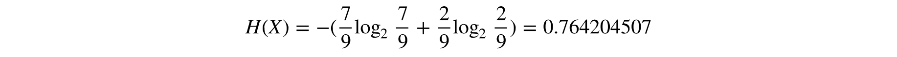 决策树通常都是用流程图显示决策过程的。最上面的方框是根节点, 包括所有要测试的解释变量。在根节点里我们还没有开始测试, 所以变量的熵设为0.985228136。前面我们介绍过, 将解释变量是否喜欢玩球转换成二元变量, 左子节点用0表示,右子节点用1表示。左子节点包括7只猫和2条狗都是不喜欢玩球的数据。计算这时解释变量的熵:
