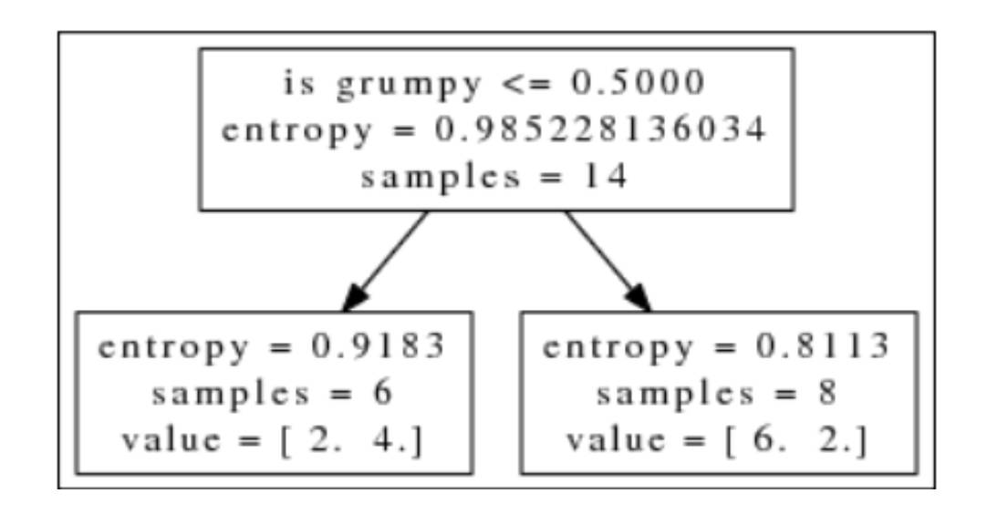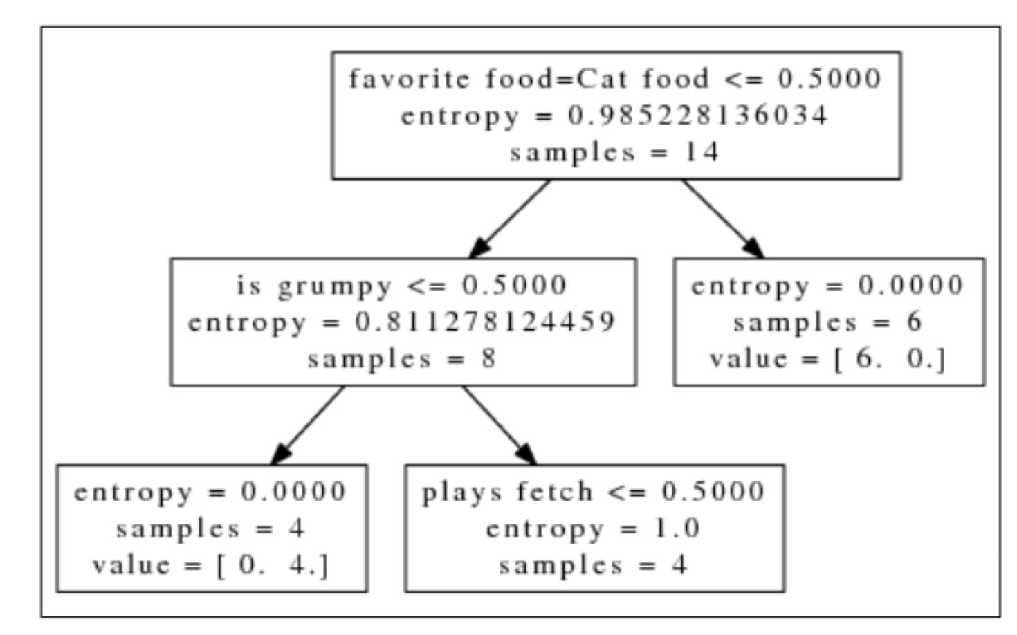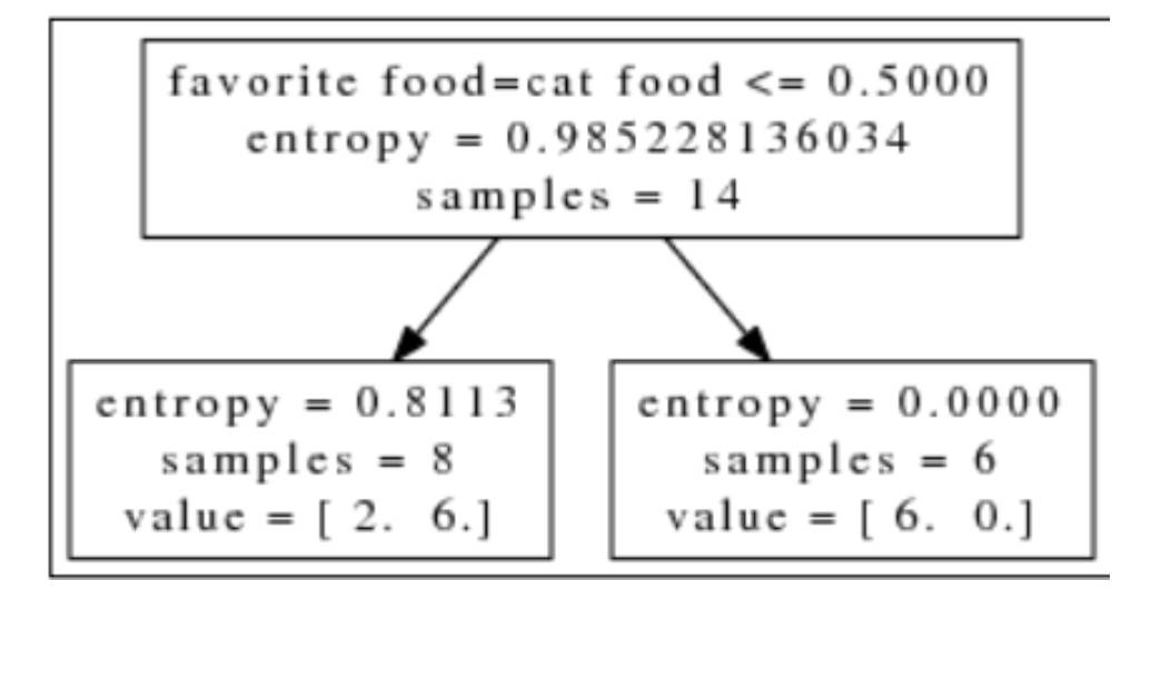 对解释变量最喜欢的食物的值是猫粮进行测试的结果是, 右节点喜欢猫粮的动物中6只猫没有狗, 其熵为0, 而做节点2只猫6条狗, 其熵为0.8113比特。我们如何评估哪一个变量最大程度的降低了分类的不确定性? 子集熵的均值看起来像是一个合理的度量指标。本例中,猫粮测试这个子集熵的均值最小。直观上看, 这条测试也更有效, 因为我们可以用它识别出几乎是一半样本。但是, 实际上这么做可能做导致决策局部最优值。例如, 假设有一个子集的结果是两条狗没有猫, 另一个子集的结果是4条狗8只猫。第一个子集的熵是0, 而第二个子集的熵0.918。那么平均熵是0.459, 但是第二个子集包含了绝大多数样本, 而其熵接近1比特。