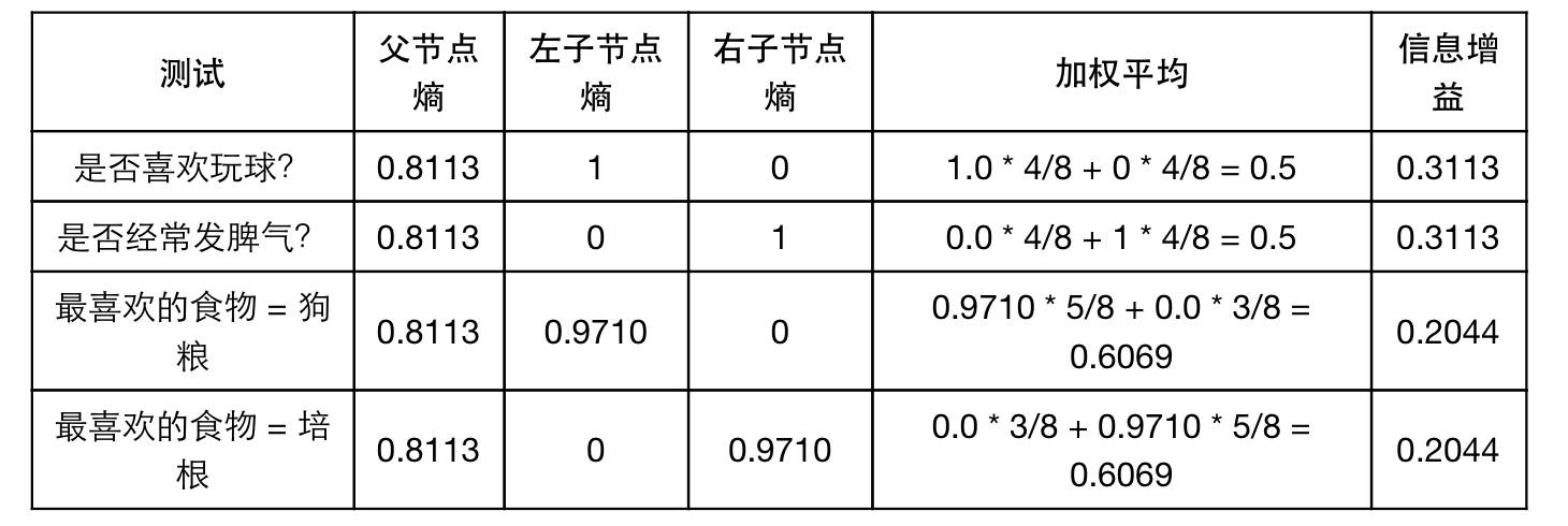 现在我们对剩下的解释变量进行信息增益计算,包括是否喜欢玩球?, 最喜欢的食物 =狗粮, 最喜欢的食物 =培根,这些解释变量测试的结果都是一个节点是一只猫或一条狗, 另一个节点是剩下的动物。其信息增益计算结果如下表所示: