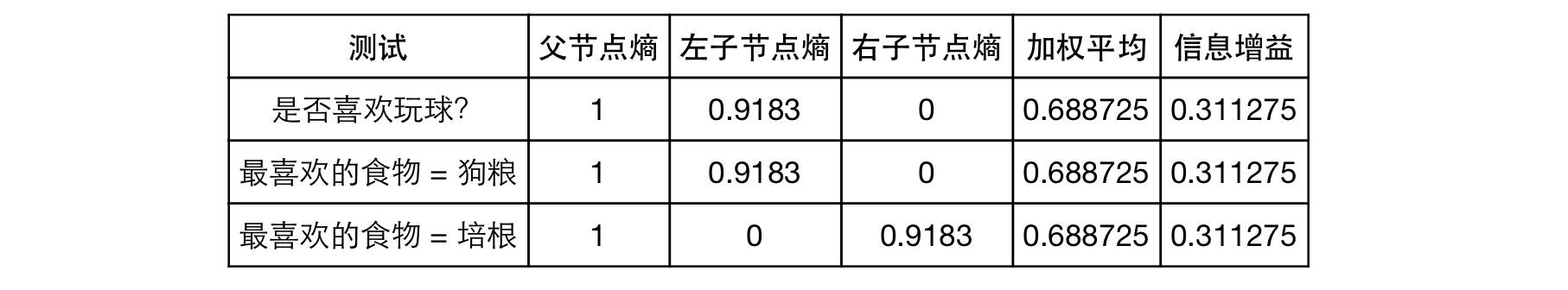 下表就是本例信息增益的计算结果。可以看出,猫粮测试是最佳选择,因为其信息增益最大。