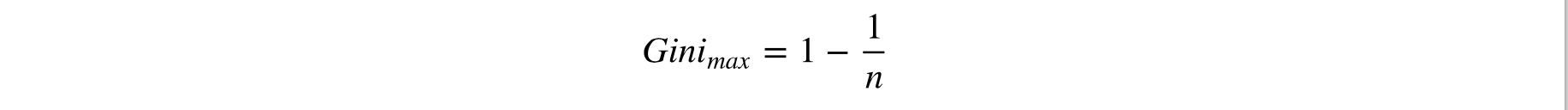 可以看出, 如果集合中只有一类, 那么基尼不纯度值为0。和熵一样, 当每个类型概率相同时, 基尼不纯度最大。此时, 基尼不纯度的最大值有类型的数量决定: