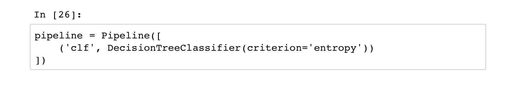 我们创建了pipeline和DecisionTreeClassifier类的实例, 将criterion参数设置成entropy, 这样表示使用信息增益启发式算法建立决策树。