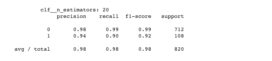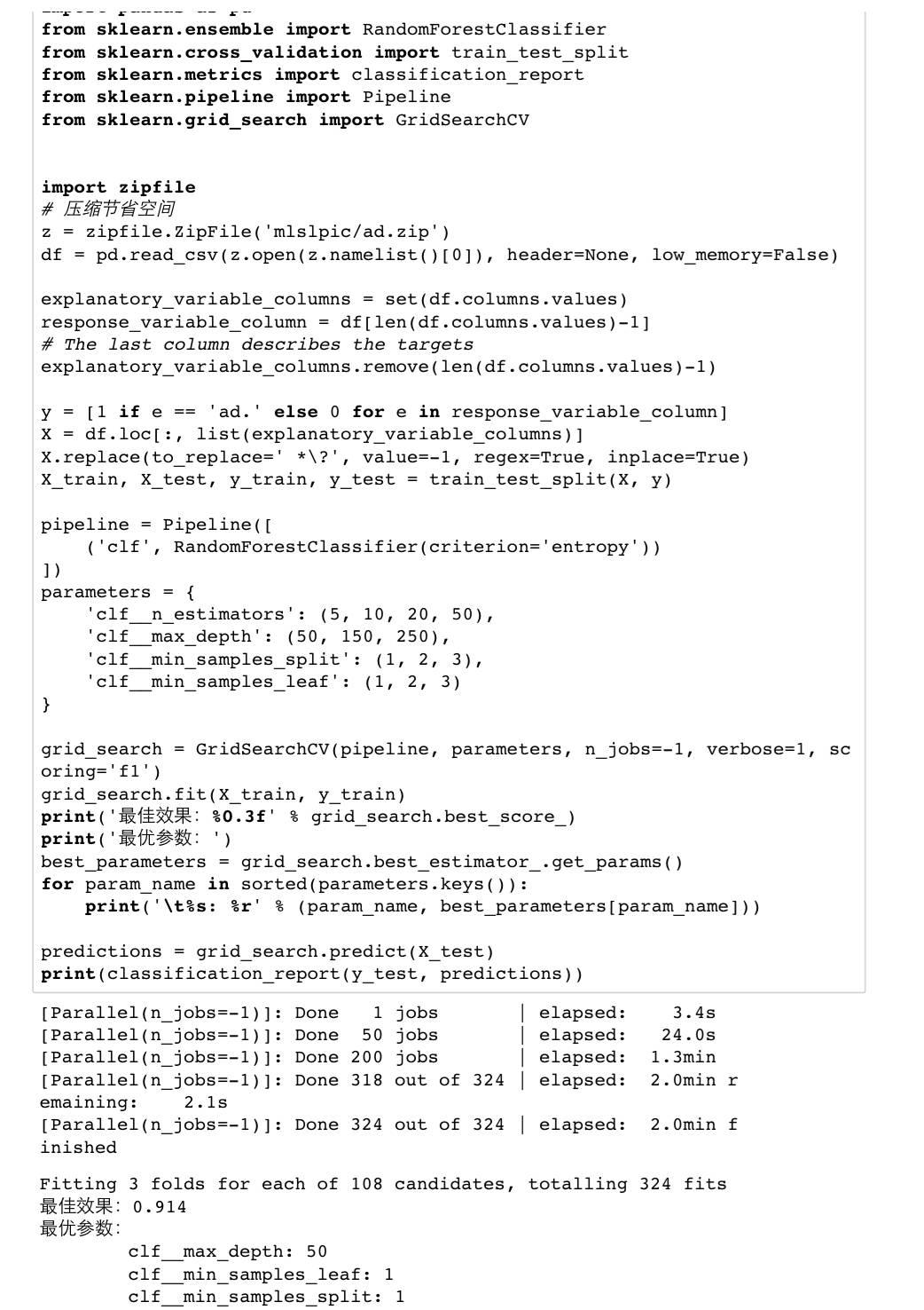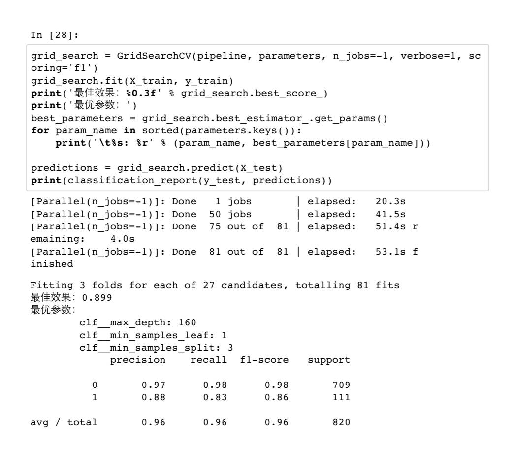 下面我们用随机森林升级我们的广告屏蔽程序把前面用的DecisionTreeClassifier替换成RandomForestClassifier就可以了和前面一样我们仍然用网格搜索来探索最优超参数。