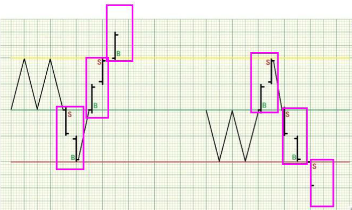 2.上图第二类紫色区域,是通道阻力失败形态,也可以称为通道下轨下突破后 回抽失败再上突破形态。这种形态是相对难以把握的一种,如下图: