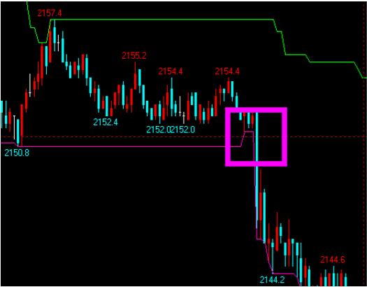 有很多人喜欢等突破后进场,比如上图在2150.8之下,并且有很大量能的时候 再进单,这种方法我并不反对,但是作为短线来说,这种方法有点太危险。一是股 指的这种破位点,一般是数个大单在1秒之内直接贯穿30-50跳价位,也就是6-10 个点,之后再进单,面临短线获利盘平仓的风险。但中长线有中长线的考虑,这样 明确的突破,结合大级别的形态,后续的力量还是相对有一定保证的。