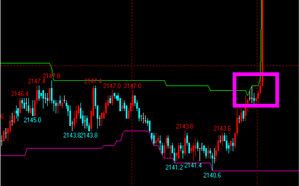 1.上图中的第一类紫色区域位置,是一般的突破形态,是单纯的通道破坏,形成了第一种比较明确的交易机会,如下图: