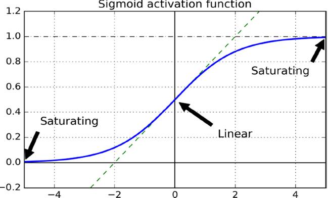 起初采用正态分布随机化初始权重,会使得原本单位的variance逐渐变得非常大。例如下图的sigmoid函数,靠近0点的梯度近似线性很敏感,但到了,即很强烈的输入产生木讷的输出。