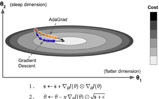 各个维度计算梯度作为分母,加到当前梯度上,不同维度梯度下降不同。如下图所示,横轴比纵轴平缓很多,传统gradient仅仅单纯沿法线方向移动,而AdaGrad平缓的θ1走的慢点,陡的θ2走的快点,效果较好。