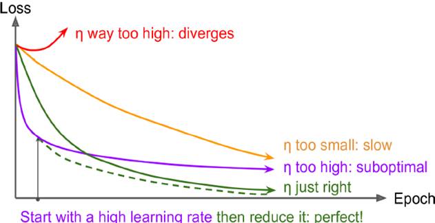 learning rate的设置也很重要,如下图所示,太大不会收敛到全局最优,太小收敛效果最差。最理想情况是都一定情况缩小learning rate,先大后小
