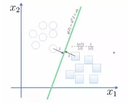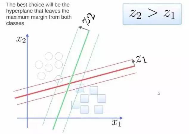 要将两类分开,想要得到一个超平面,最优的超平面是到两类的 margin 达到最大,margin就是超平面与离它最近一点的距离,如下图,Z2>Z1,所以绿色的超平面比较好。