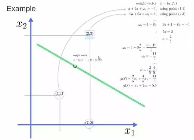得到weight vector为(a,2a),将两个点代入方程,代入(2,3)另其值=1,代入(1,1)另其值=-1,求解出 a 和 截矩 w0 的值,进而得到超平面的表达式。