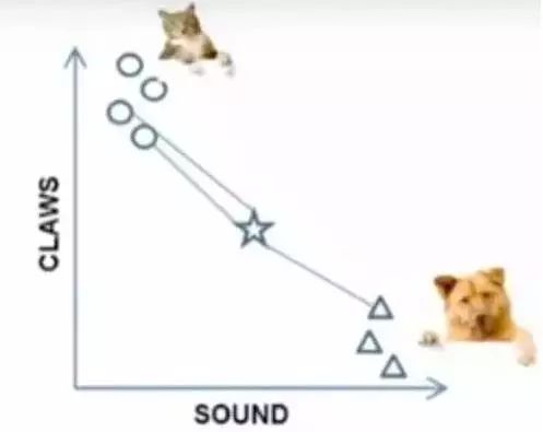 例子:要区分“猫”和“狗”,通过“claws”和“sound”两个feature来判断的话,圆形和三角形是已知分类的了,那么这个“star”代表的是哪一类呢?