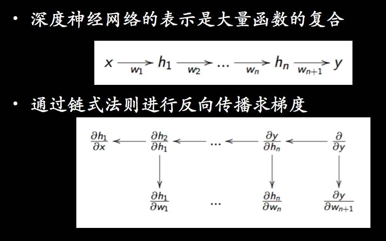 深度学习是人工神经网络 2006 年后重获新生的名称,伴随着其实际应用中的超越式效果而风靡全球。使之成为可行的方法的计算设备 GPU 也因此大卖特卖,成为深度学习研究必备利器。人工神经网络已经可以实现任意复杂度连续函数的逼近,这个可以在 Michael Nielsen 的《神经网络和深度学习》书中看到神经网络可以计算任何函数的具体化的证明。而深度学习则可以利用超多的隐藏层来提升表示的能力(浅层网络需要指数级的隐藏元个数才能达到相当的深层网络的表达能力)。深度学习的表示其实是大量函数的复合,并可以通过反向传播进行训练,参见下图。