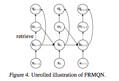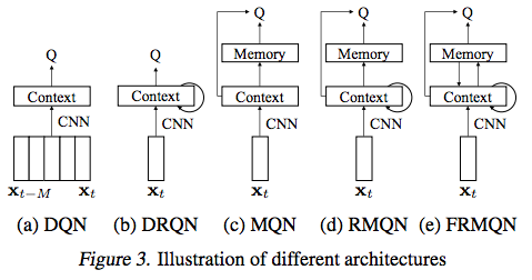MQN 仅仅依赖当前观察,除了当前输入用来做强化学习问题中的时态上下文的内存检索类似于 MemNN,是一个单纯的前驱网络结构构造了上下文环境;RMQN 则是循环结构使用 LSTM 从观察的历史信息中刻画了空间和时间信息,保证能够从 LSTM 和外部记忆中获得时态信息;FRMQN 则包含了一个从检索得到的记忆中反馈到上下文向量的链接. 如图