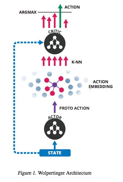 这项工作建立在 DeepMind 之前的 DDPG 等工作之上,杂糅了若干模型,并使用嵌入的方式来大幅度降低行动空间的维数,其主要过程在下图中给出: