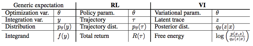 现在的深度强化学习中很多的模型是,强化学习中部分研究成果深度学习化的结果. 但最令人兴奋的是,一些新的想法,例如强化变分推断,在Theophane Weber 等人的论文中,就将 VI 和 RL 进行了联系. 参见下图的对比: