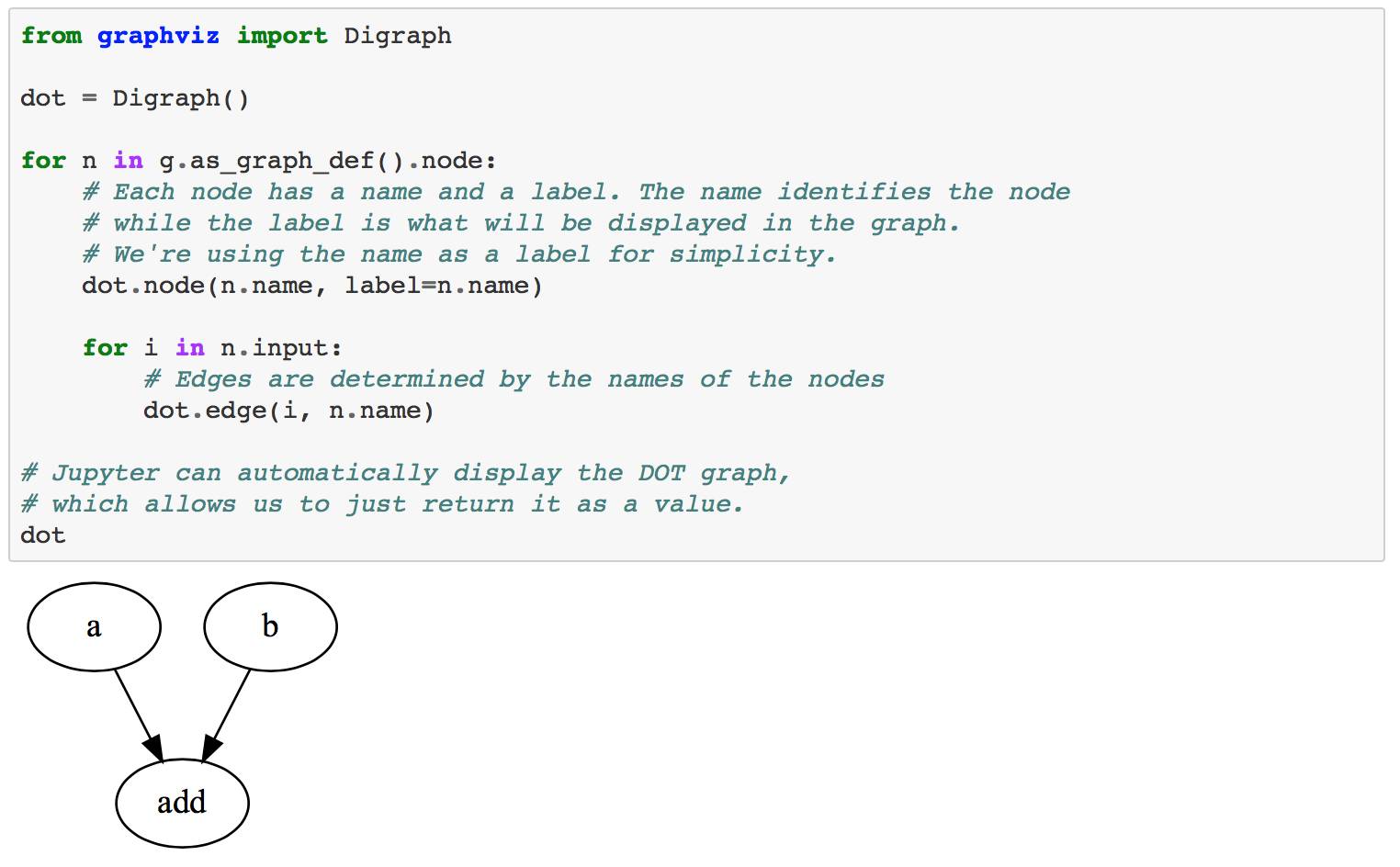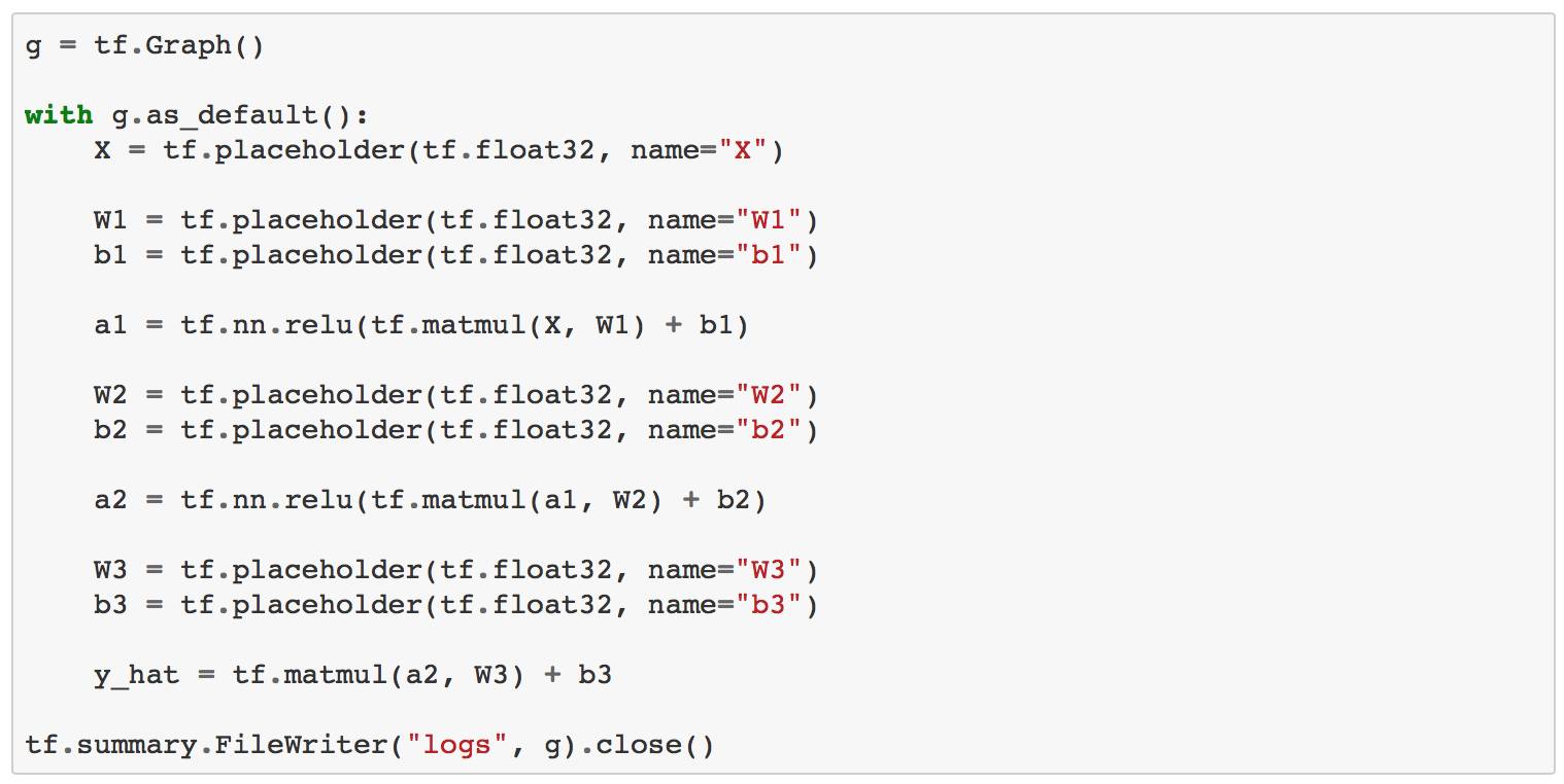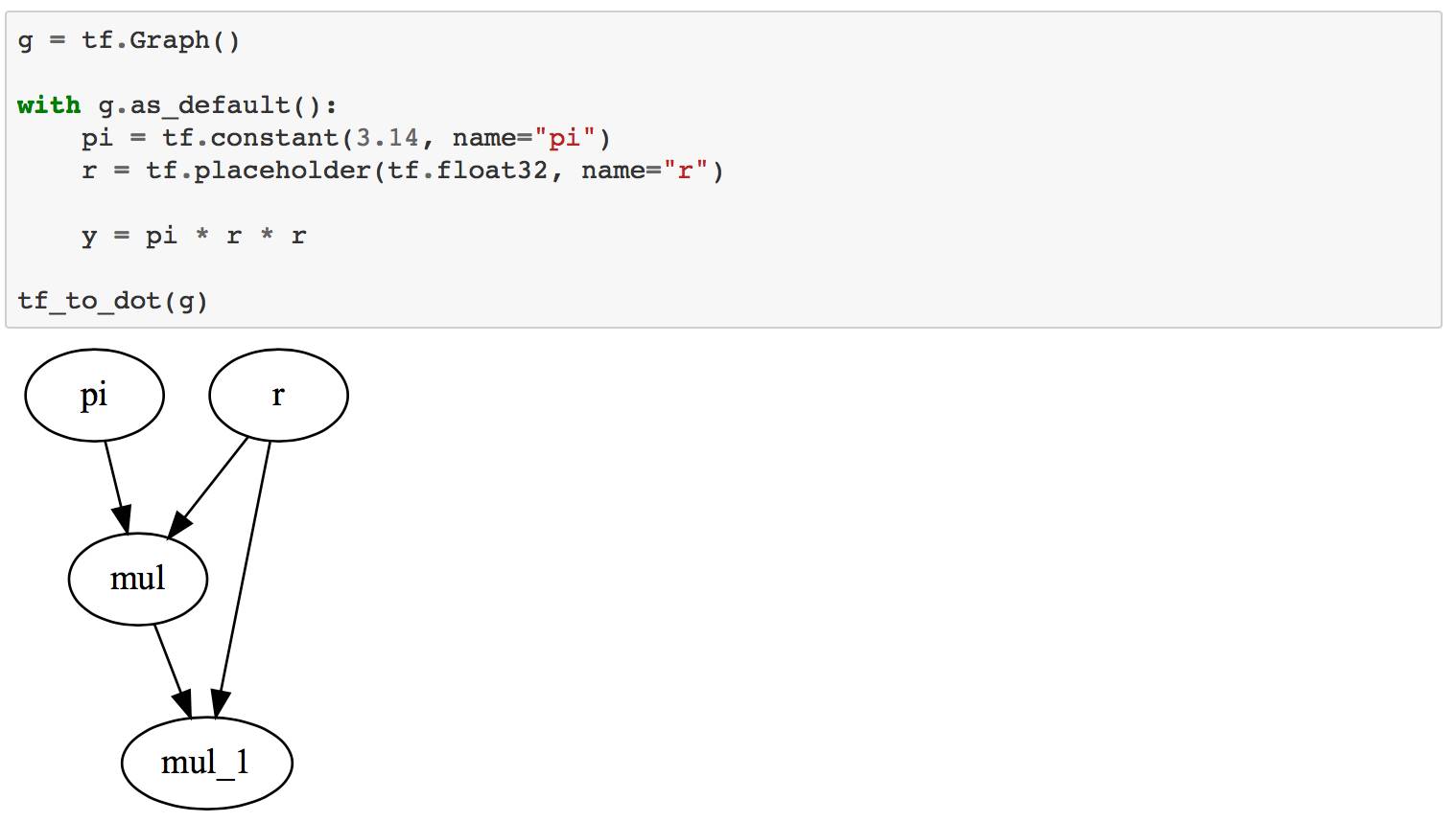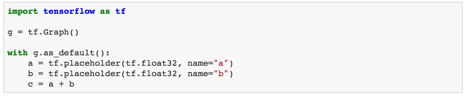 首先,让我们创建一个简单的TensorFlow图。 常规操作(如使用tf.placeholder)会在所谓的默认图形中创建一个节点。 我们可以通过tf.get_default_graph()访问它,但是我们也可以临时更改它。 在下面的示例中,我们将创建一个tf.Graph对象的新实例,并创建一个添加两个变量的例子。