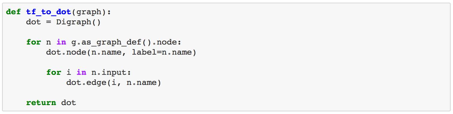 图形定义本身将非常简单,我们将从TensorFlow本身的一个类似的代码(在graph_to_dot.py中)获得灵感,该代码生成给定GraphDef的DOTgraph文件格式。 不过,它只能作为命令行脚本使用,因此我们不能直接从我们的代码中调用它。 这就是为什么我们想自己来实现它,但不要担心,它只会是几行代码。
