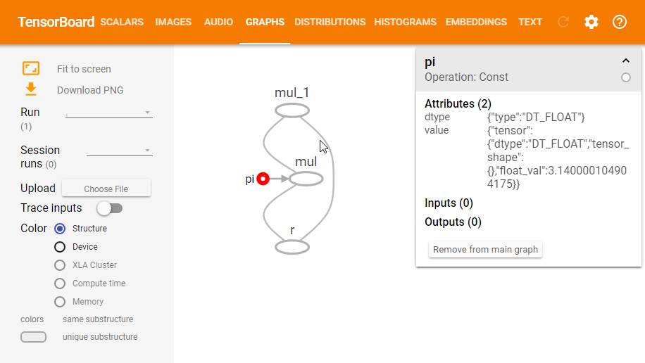 结果有三个节点。 一个是每一个变量,另一个用于添加操作。 占位符变量节点有一个名称,因为我们在调用tf.placeholder时明确命名它们。 如果我们省略了name关键字参数,TensorFlow将简单地生成一个名称,就像在add操作中一样。