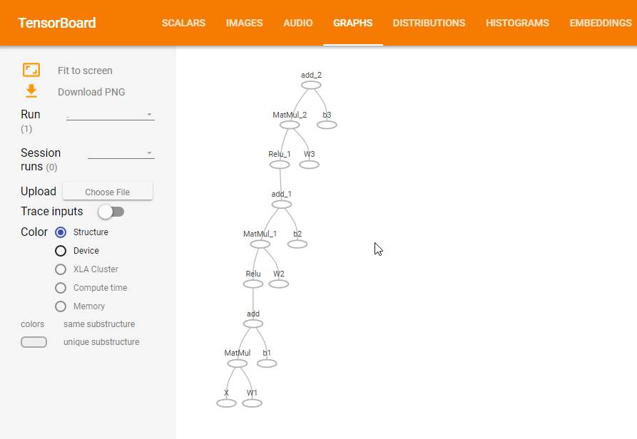 GraphViz对于可视化小图很适用,神经网络可以增长到相当大的大小。 TensorBoard允许我们轻松地将的方程组分成有效范围,然后在结果图中将其视觉分离。 但是在这样做之前,让我们尝试用TensorBoard来显示我们之前的图形。