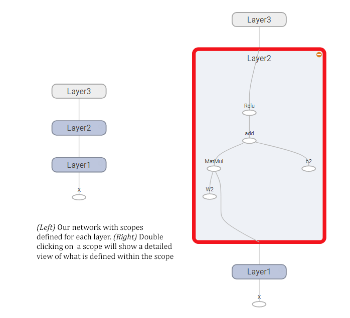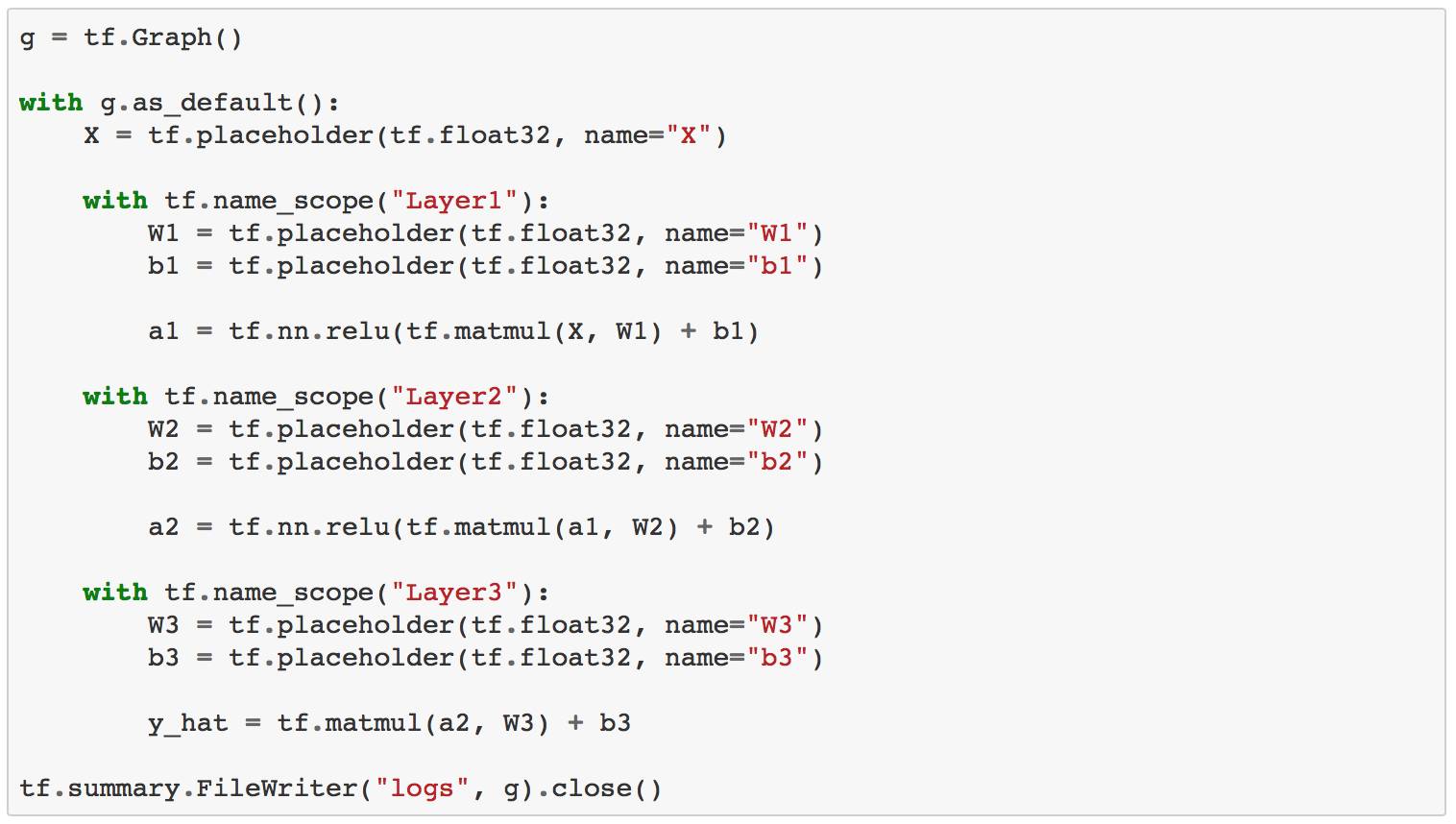 我们可以通过使用上述的tf.name_scope函数来改善这一点。 让我们重写前馈网络代码,将每个层分成自己的scope。