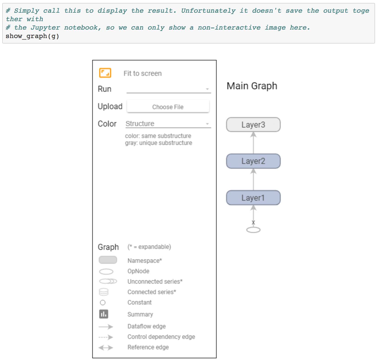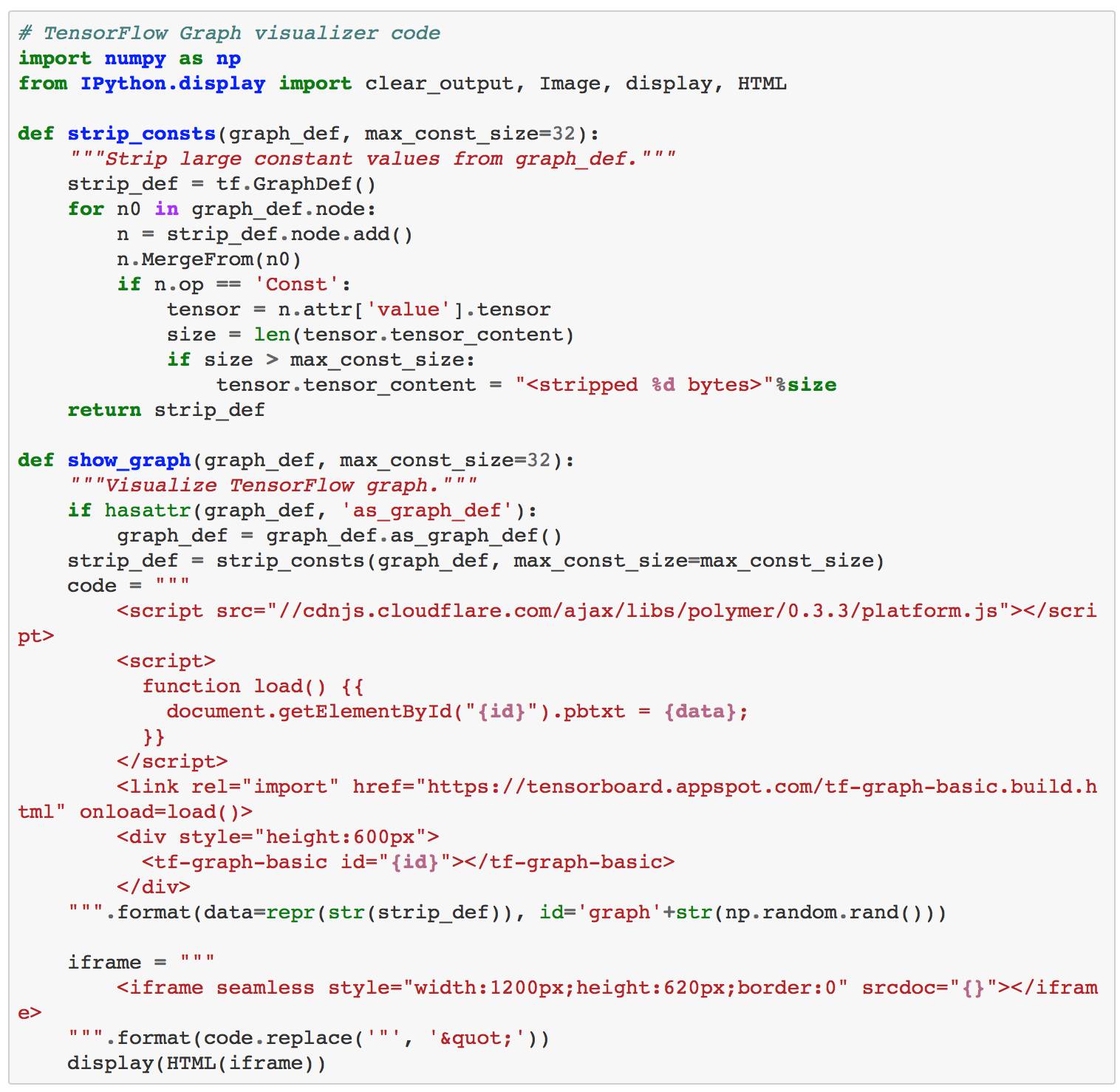 这是它的整体片段。 所有你需要做的是调用show_graph(),它将处理所有内容,如下面的例子,如上图g所示。 这种方法明显的优点是你不需要运行TensorBoard来可视化数据,但你也需要访问互联网。