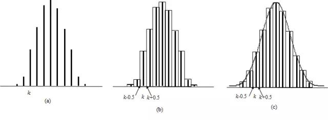 (a)概率函数直条图;(b)连续性校正直方图;(c)正态近似图