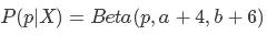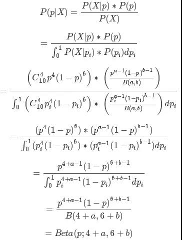 那么现在我们又做了10次实验,其中4次为正,6次为反,称为信息X。那么我们现在要计算得到信息X后概率p的分布,即P(p|X),根据贝叶斯条件概率计算公式