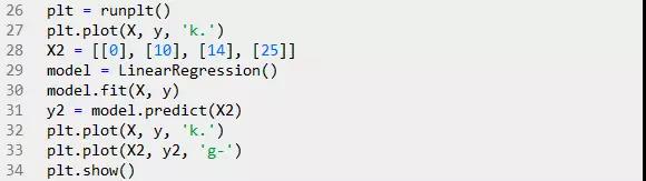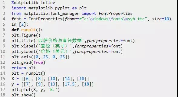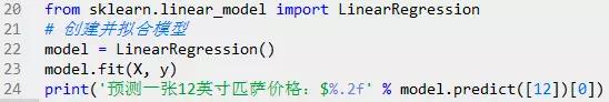 上图中,'x'轴表示匹萨直径,'y'轴表示匹萨价格。能够看出,匹萨价格与其直径正相关,这与我们的日常经验也比较吻合,自然是越大越贵。下面就用scikit-learn来构建模。