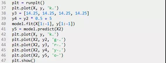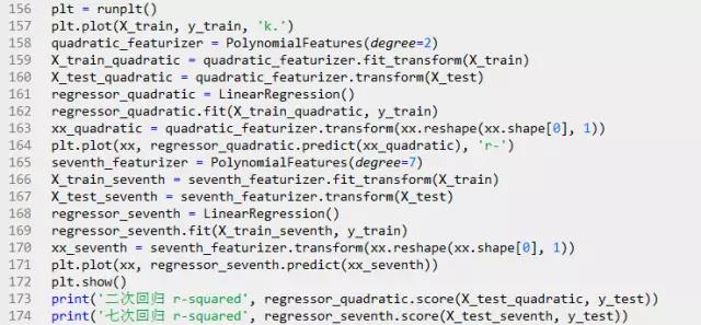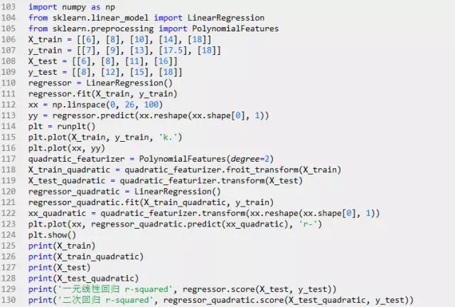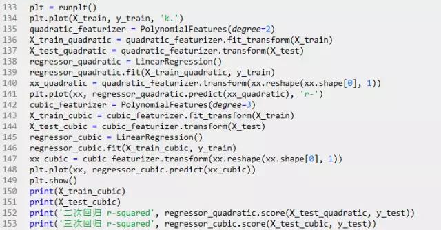 只用一个解释变量,但是模型有三项,通过第三项(二次项)来实现曲线关系。PolynomialFeatures转换器可以用来解决这个问题。代码如下: