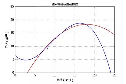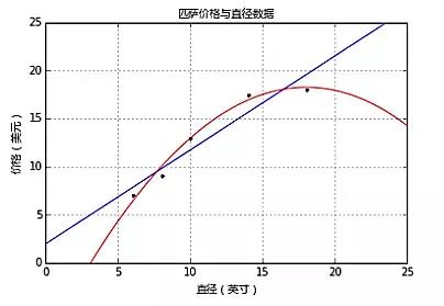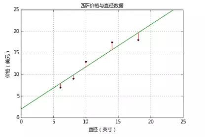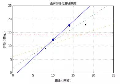 这样就通过最小化成本函数求出模型参数了。把匹萨直径带入方程就可以求出对应的价格了,如11英寸直径价格$12.70,18英寸直径价格$19.54。