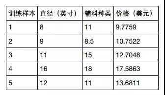 其中,Y是训练集的响应变量列向量,贝塔是模型参数列向量。X称为设计矩阵,是m*n维训练集的解释变量矩阵。m是训练集样本数量,n是解释变量个数。增加辅料的匹萨价格预测模型训练集如下表所示: