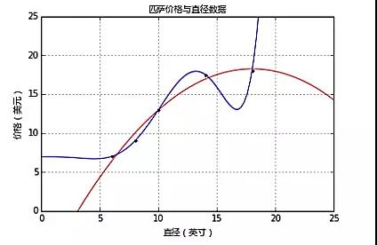 增加解释变量让模型拟合效果更好了。为什么只用一个测试集评估一个模型的效果是不准确的,如何通过将测试集数据分块的方法来测试,让模型的测试效果更可靠。不过现在至少可以认为,匹萨价格预测问题,多元回归确实比一元回归效果更好。假如解释变量和响应变量的关系不是线性的呢?下面来研究一个特别的多元线性回归的情况,可以用来构建非线性关系模型。