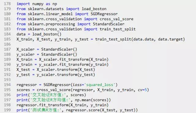 下面用scikit-learn的SGDRegressor类来计算模型参数。它可以通过优化不同的成本函数来拟合线性模型,默认成本函数为残差平方和。本例中,我们用波士顿住房数据的13个解释变量来预测房屋价格: