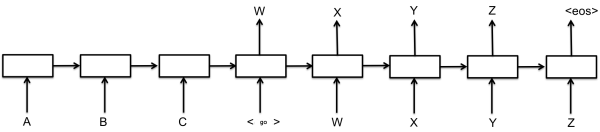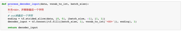 我们此时只看右边的Decoder端,可以看到我们的target序列是[<go>, W, X, Y, Z, <eos>],其中<go>,W,X,Y,Z是每个时间序列上输入给RNN的内容,我们发现,<eos>并没有作为输入传递给RNN。因此我们需要将target中的最后一个字符去掉,同时还需要在前面添加<go>标识,告诉模型这代表一个句子的开始。